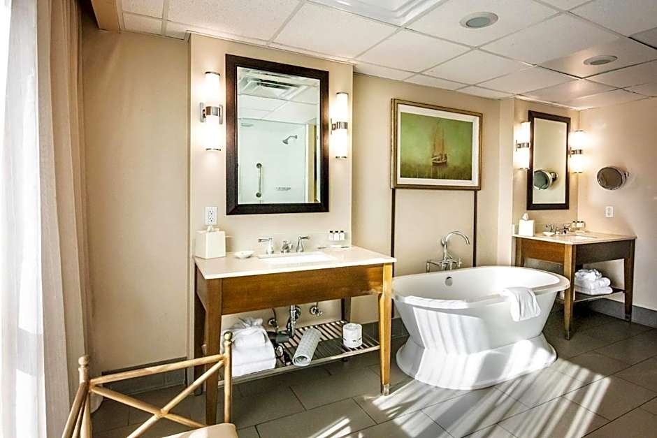 This accessible room features a bath tub, flat-screen cable TV, and seating area.